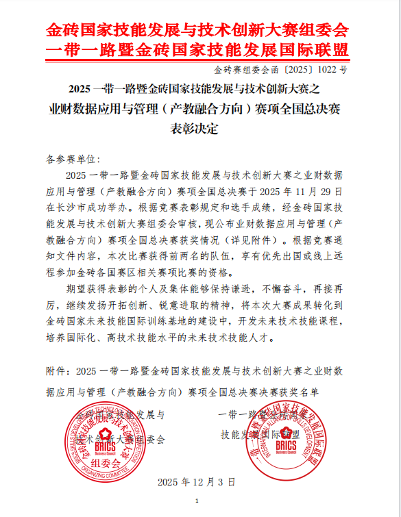 近日,2025一带一路暨金砖国家技能发展与技术创新大赛之业财数据应用与管理(产教融合方向)赛项全国总决赛在湖南商务职业技术公司圆满落幕。yl7703永利集团官网yl7703永利集团官网派出康蕊、赵甘露、王子怡、杨黎敏及赵思甜、孟琬、杨殿杰、钱卓亚8名同学组成的两支参赛团队表现亮眼,凭借扎实的专业功底和默契的团队协作,从众多参赛队伍中脱颖而出,双双斩获高职组三等奖,为公司赢得了荣誉。