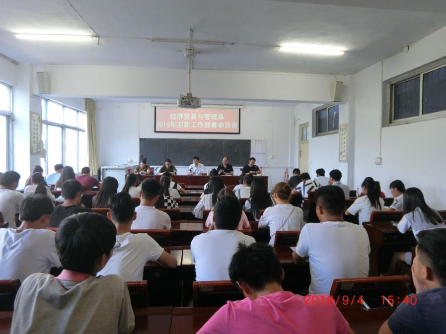新学期,新血液。为了确保今年新生入学各项工作井然有序、高标准、高质量完成,真正做到让新生满意,让新生家长放心,让社会认可。经济贸易与管理系于2016年9月4日下午在1301教室举行了2016新生接待部署工作安排会。出席的有系主任兰涛,系党总支书记张改亮,副主任李炎超,办公室主任王珂琦,团总支书记李文静。会议由兰主任主持。