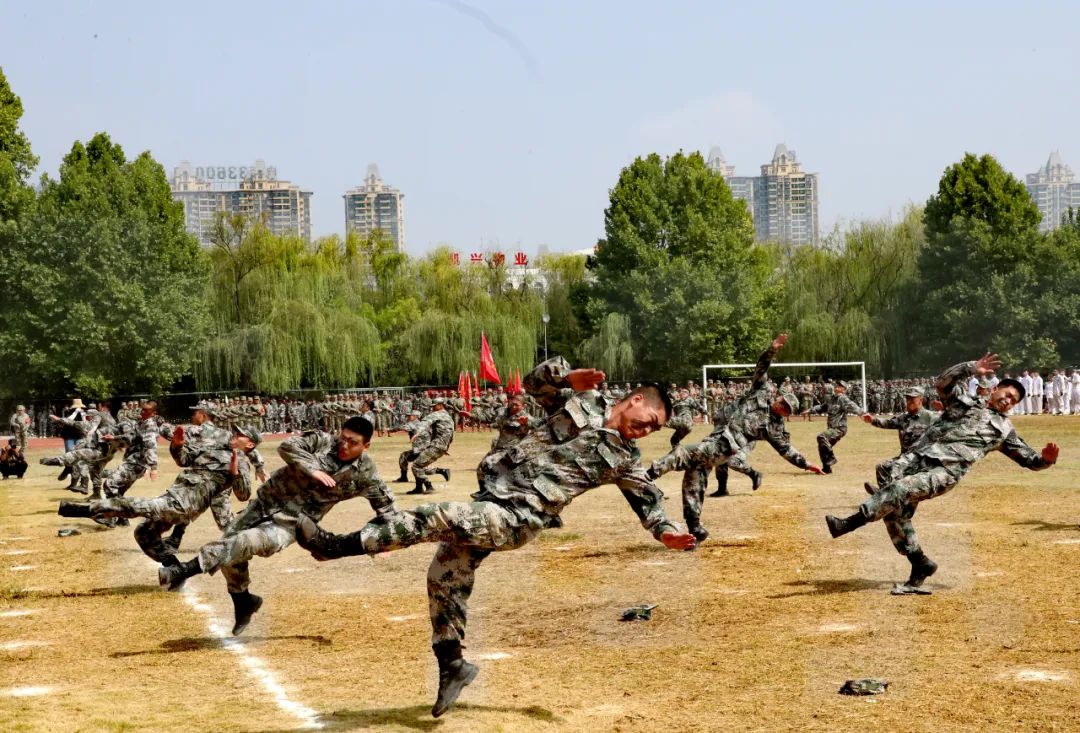 身穿迷彩服的员工带来队列动作、匕首操、格斗术、战旗出征展演,现役教官表演刺杀操,1000名新生进行心意六合拳表演,只见他们一招一式,队列整齐,动作化一,气宇轩昂,展示了出色的军事技能和新时代青年人的血性胆气。