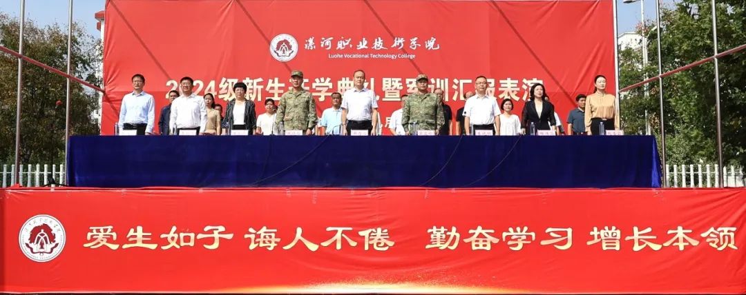 上午10时,在雄壮的国歌声中,全体师生迎着朝阳,肃立行礼,齐唱国歌,2024级新生开学典礼暨军训汇报表演正式拉开序幕。