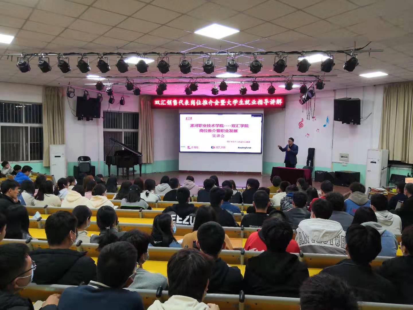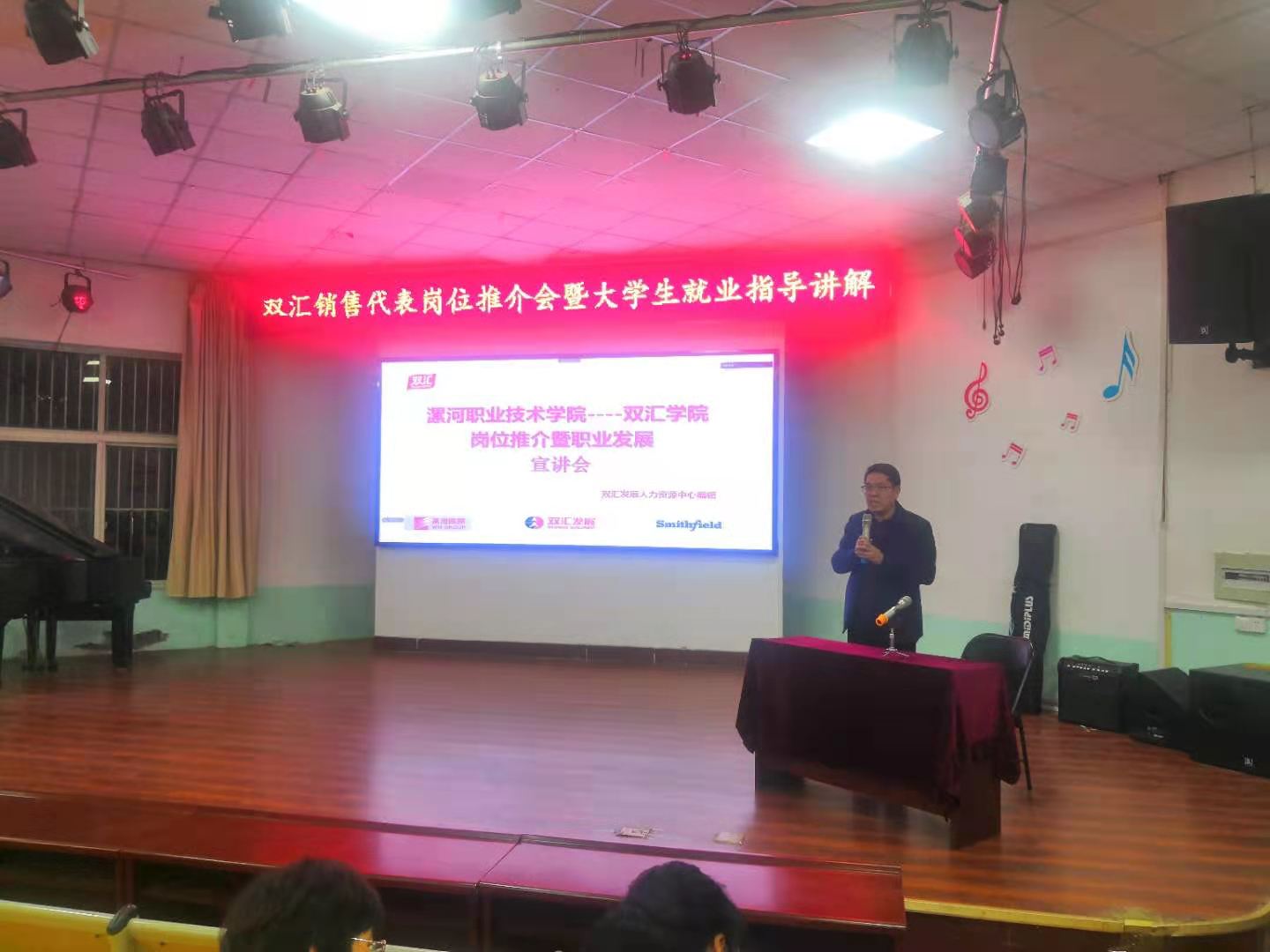 3月24日晚上,双汇集团人力资源部副总潘硕在小礼堂为200多名在校生,做了双汇销售代表岗位推介会暨老员工就业指导讲解。双汇公司党总支书记张改亮主持。