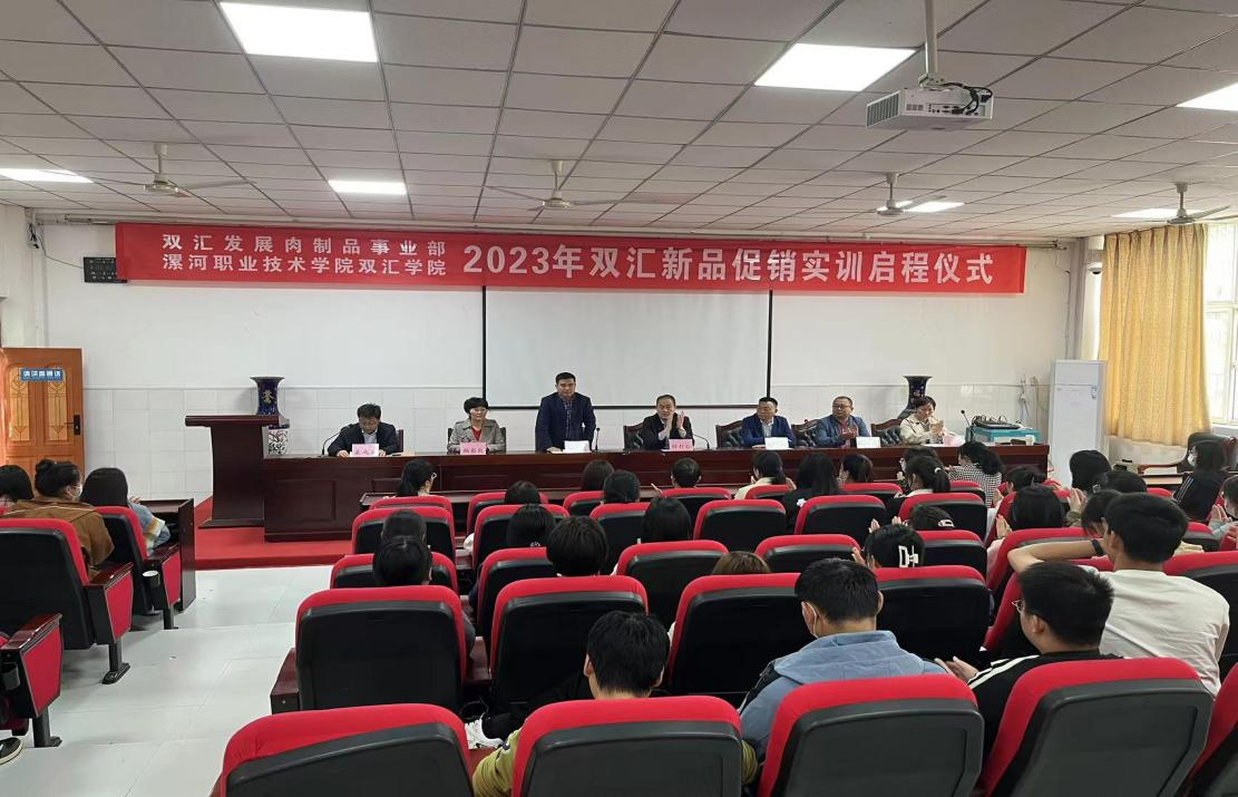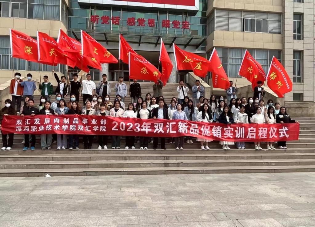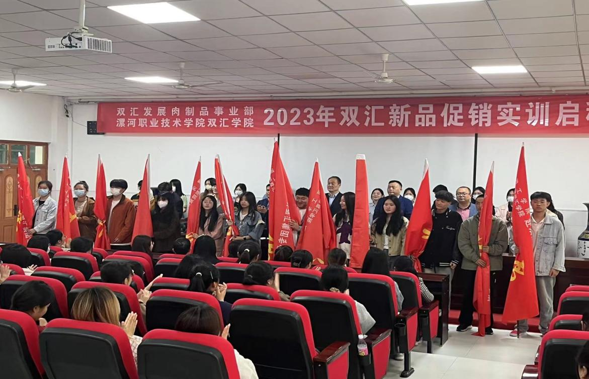 2023年双汇新品促销实训活动启程仪式由双汇发展肉制品事业部和yl7703永利集团官网双汇公司共同举行。漯河职业技术公司党委副书记薛存心和双汇发展肉制品事业部销售总监赵伟波、商超部部长胡晓光等领导出席讲话并向即将实习出征员工代表授旗。