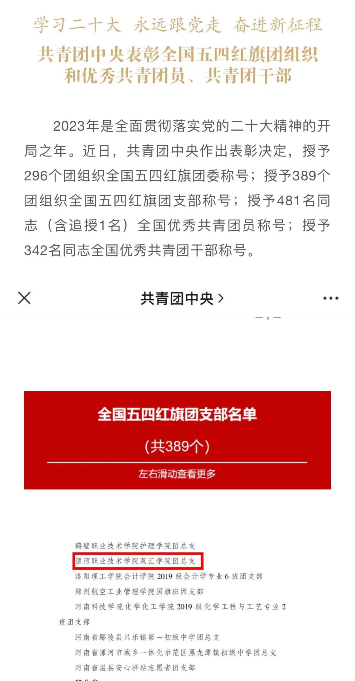 2023年是全面贯彻落实党的二十大精神的开局之年。近日,共青团中央作出表彰决定,授予296个团组织全国五四红旗团委称号;授予389个团组织全国五四红旗团支部称号;授予481名同志(含追授1名)全国优秀共青团员称号;授予342名同志全国优秀共青团干部称号。yl7703永利集团官网双汇公司团总支荣获“全国五四红旗团支部”荣誉称号,这是共青团中央授予全国基层团组织的最高荣誉。