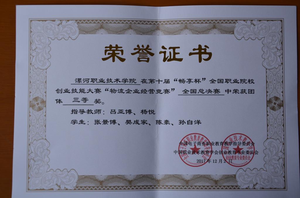 2017年12月2日,第十届“畅享杯”全国职业院校创业技能大赛暨物流企业经营技能竞赛全国总决赛在湖北武汉举行。公司工商管理系荣获团体一等奖一项,三等奖一项,再次展现了公司物流管理专业的办学实力。