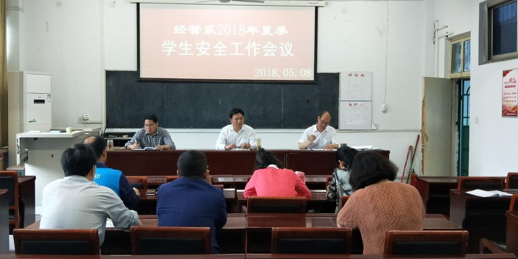 5月8日下午,经济贸易与管理系在1301会议室召开了2018年夏季员工安全工作会议,副主任李炎超主持会议,系主任兰涛、系党总支书记张改亮和全体辅导员参加了会议。