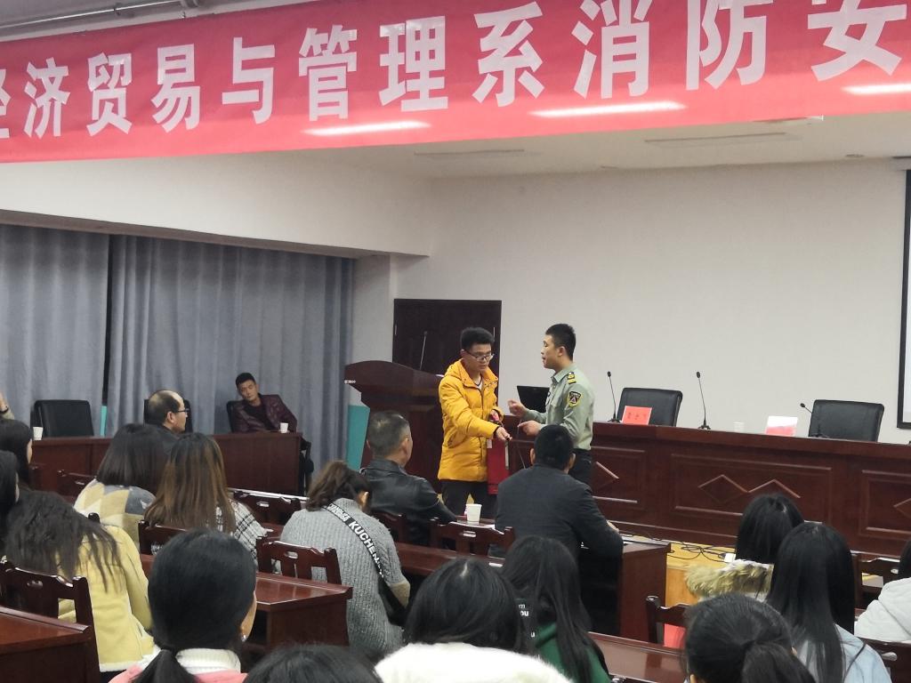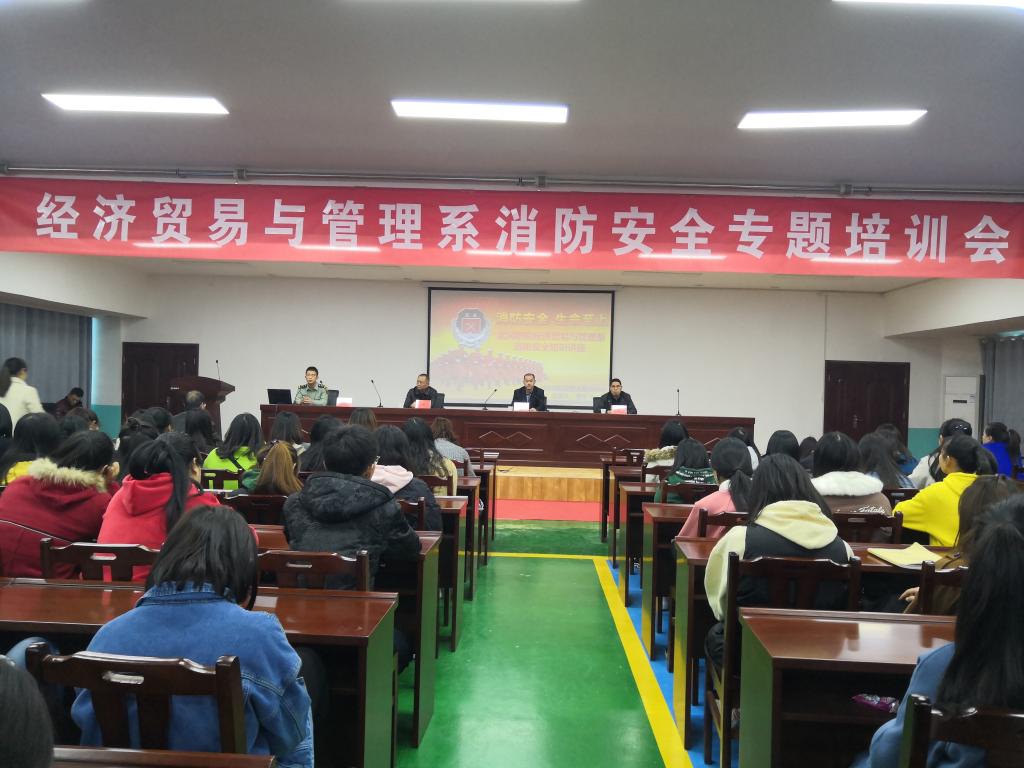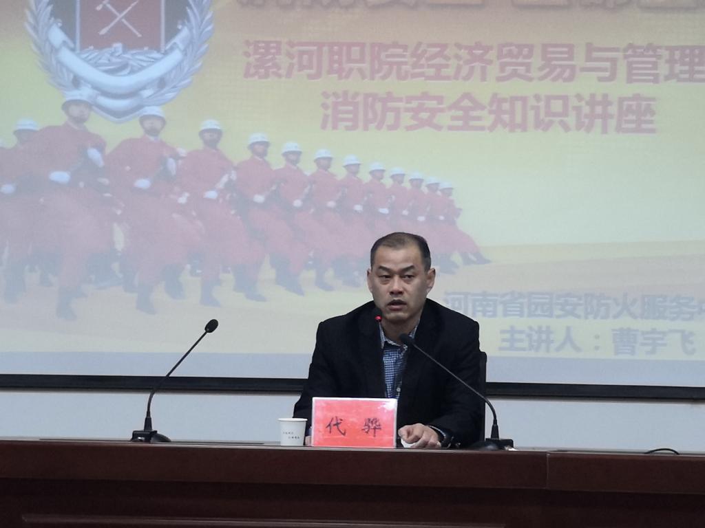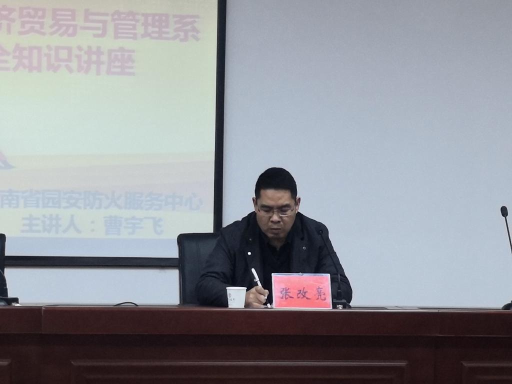 11月28日,经管系在保卫处支持下邀请河南省园安防火服务中心曹宇飞教官开展消防安全专题培训会。副经理代骅同志出席会议并讲话。保卫处处长王洪克及保卫处消防科科长牛春雨陪同参加。会议由经管系党总支书记张改亮主持。系近400名师生代表参加聆听。