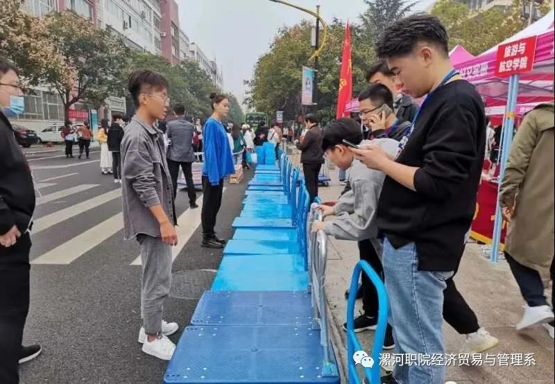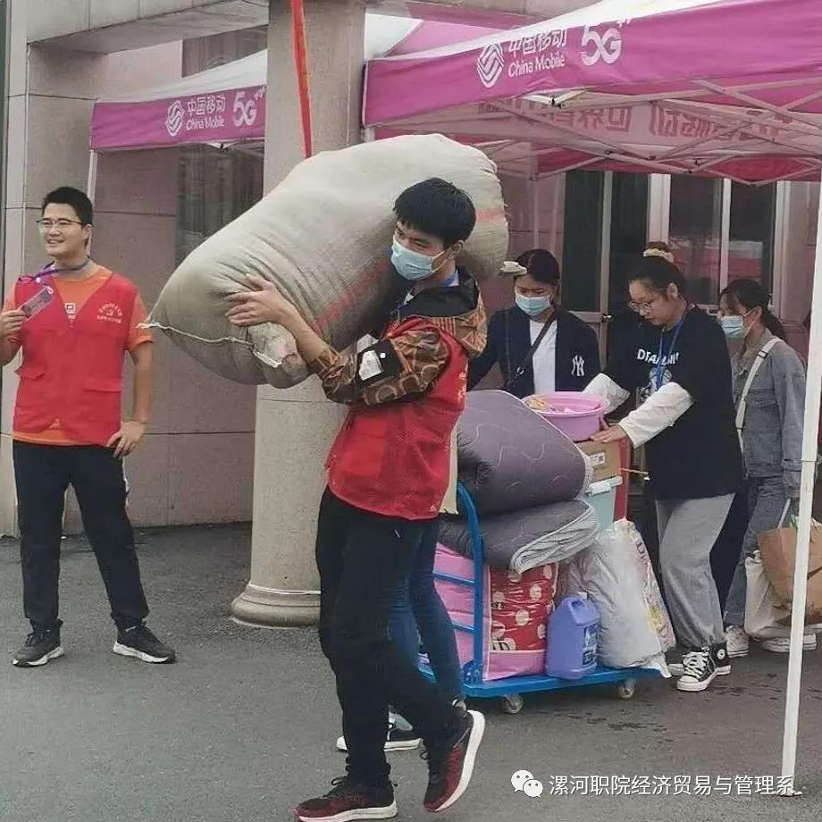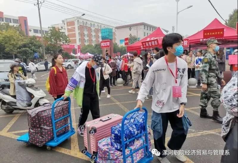 新一年有新变化,由于疫情原因,家长不便进校,所以考虑到新生们的行李搬运问题,公司安排了近三十辆小推车来运送新生们的行李。迎新工作者们用小推车拉着新生们的行李,带领着新生来到登记报到处,并在路途中,告诉他们一些具体的注意事项以及公司的基本情况。