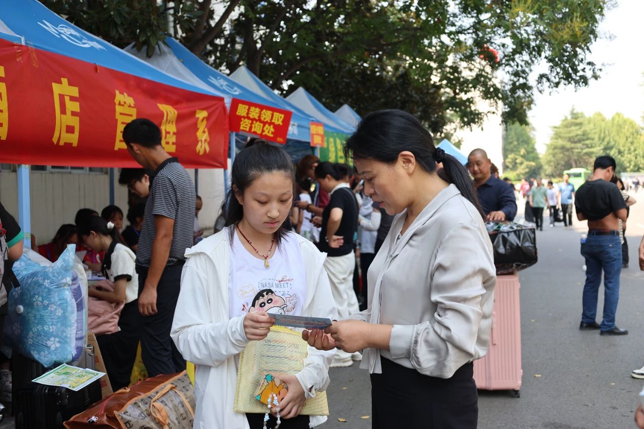 9月4日,在2024级新生报到现场,yl7703永利集团官网公司经理邢淑婕与旅游与酒店管理系的一名新生亲切交流,把一张“收费项目明白卡”交到该生手中。