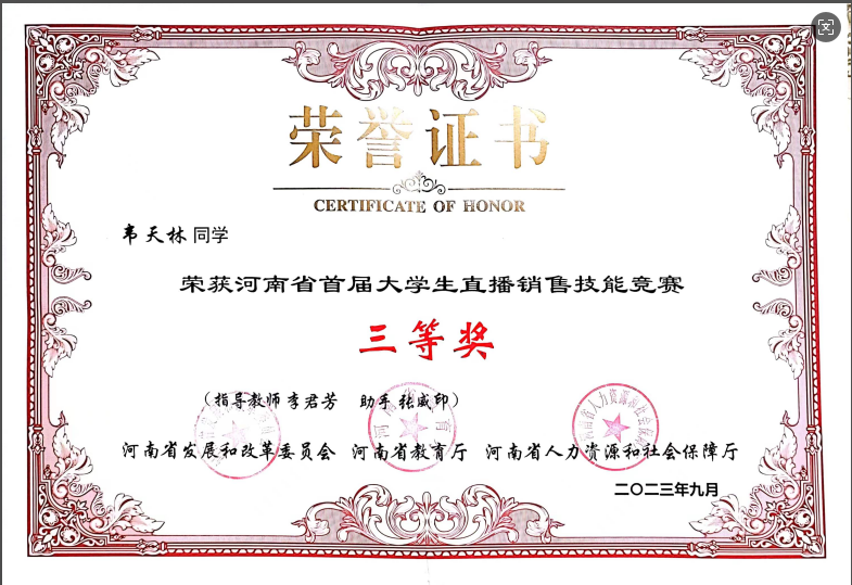 韦天林同学获得河南省首届老员工直播销售技能竞赛三等奖
